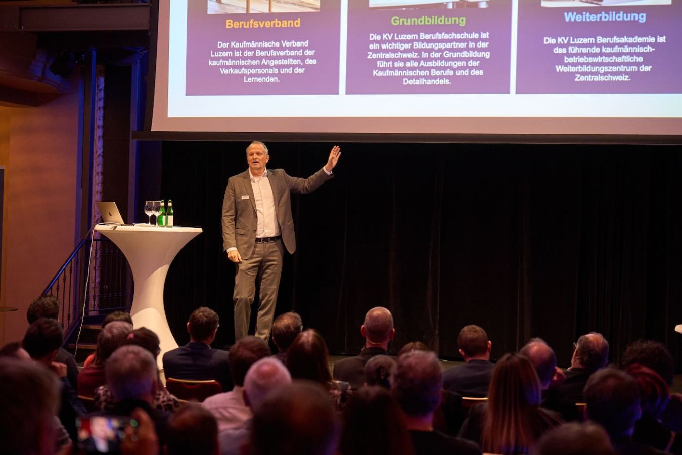 Im Referat von Dr. Nikolaus Storz, Rektor der KV Luzern Berufsakademie, wurde die Rolle des KV Luzern als umfassender Bildungspartner aufgezeigt. Mit den drei Bereichen Berufsverband, Berufsfachschule und Berufsakademie deckt das KV Luzern das gesamte Spektrum der Bildung für den Detailhandel und die kaufmännischen Berufe ab und versteht sich als Wegbegleiter über die gesamte Karriere hinweg – praxisnah, verlässlich und eng mit der Wirtschaft vernetzt. Rund 3’000 Studierende, über 100 Lehrgänge und mehr als 400 Dozierende aus der Praxis unterstreichen diese Bedeutung.
