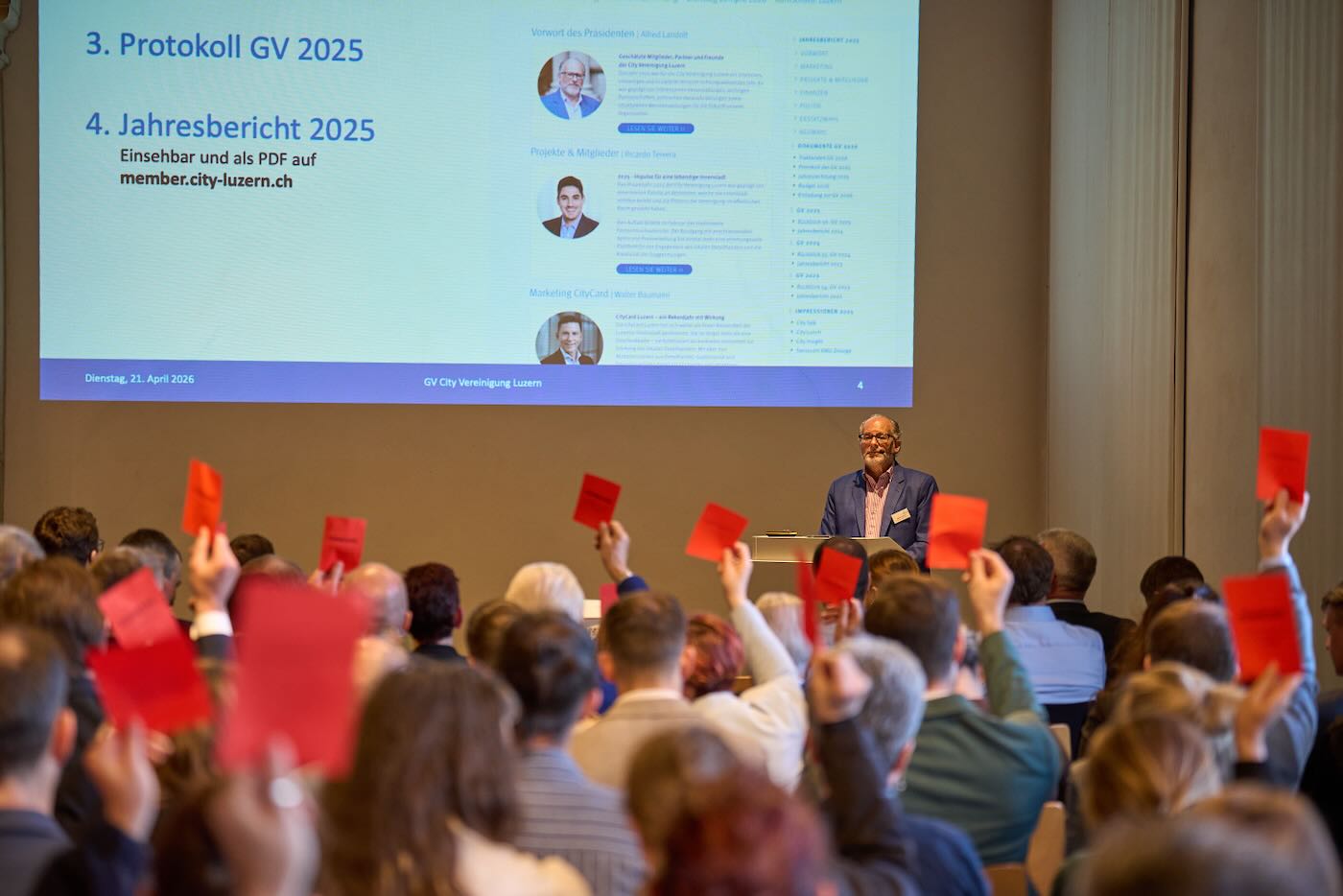 Im Anschluss wurden die statutarischen Traktanden effizient und speditiv behandelt. Sämtliche Anträge des Vorstands wurden einstimmig angenommen. Dazu gehörte unter anderem die Genehmigung des Jahresberichts 2025, der Jahresrechnung und das Budget 2026. Einen umfassenden Überblick über das vergangene Vereinsjahr bietet der veröffentlichte Jahresbericht. (LINK zum member.city-luzern.ch)