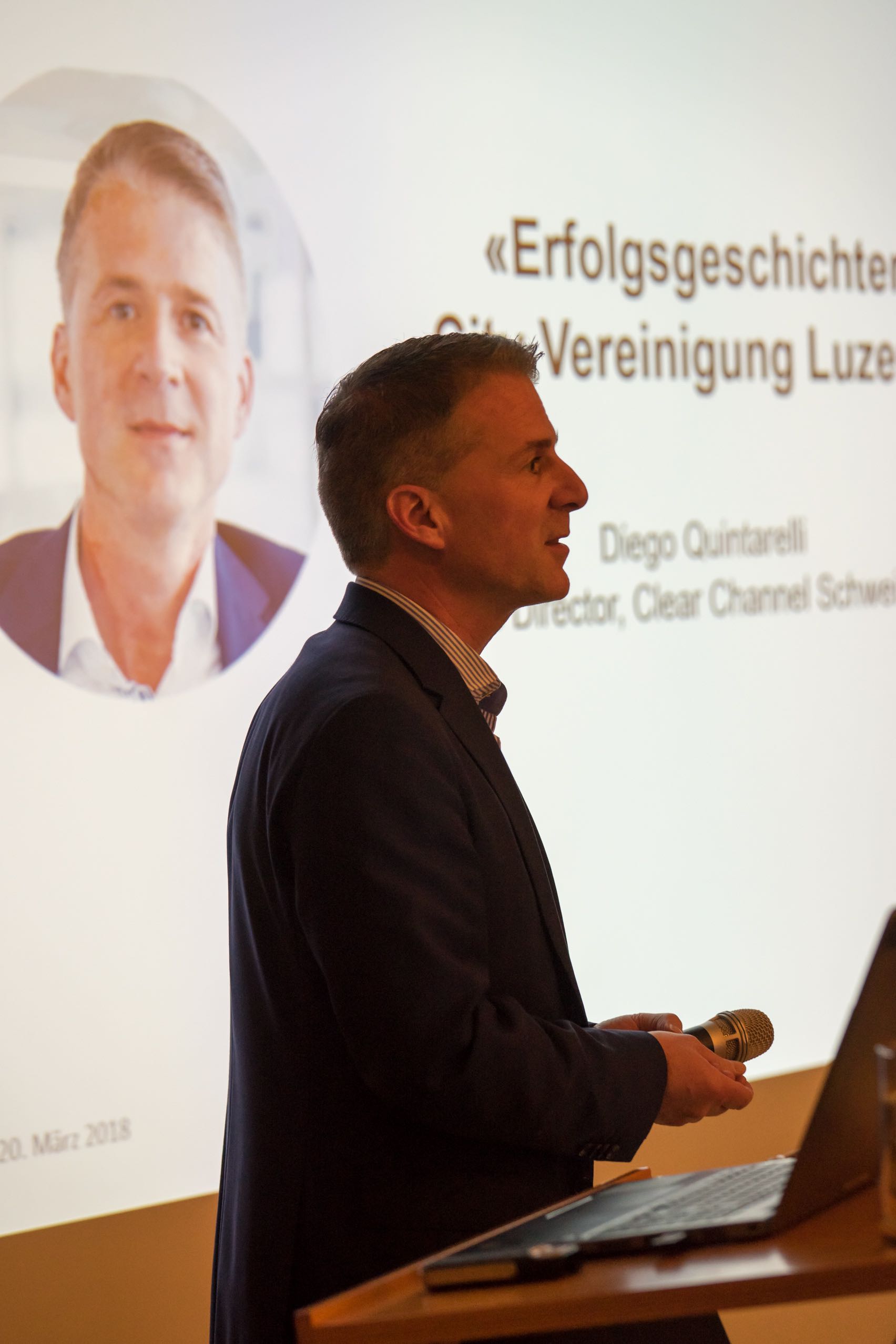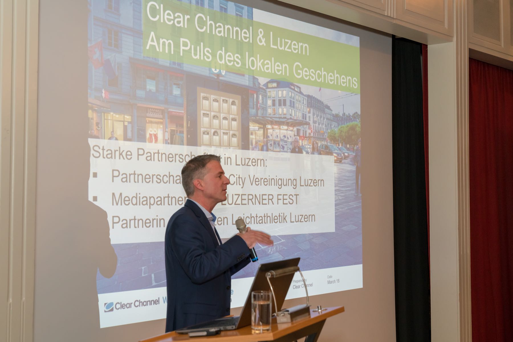 Im Namen der Clear Channel Schweiz AG präsentierte Diego Quintarelli, Sales Director, erfolgreiche Zahlen der letztjährigen Plakatkampagnen der City Vereinigung Luzern. Ebenso thematisierte er die neuen digitalen Plakatstellen, welche 2018 in Luzern eingeführt werden.