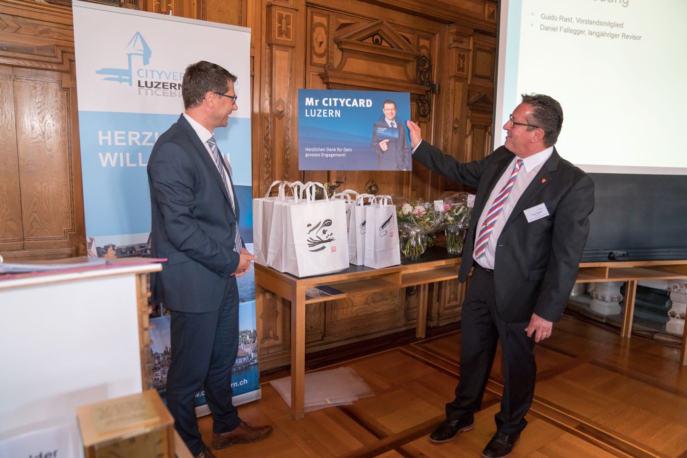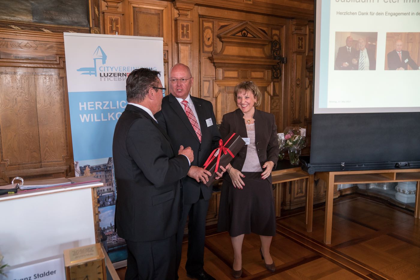 Abschliessend gab es Jubiläen und Abschiede zu vermelden: Peter Imhof, Ressort Finanzen, ist seit 20 Jahren im Vorstand der City Vereinigung Luzern. Franz Stalder amtet seit genau 10 Jahren als Präsident. Herzlichen Glückwunsch!