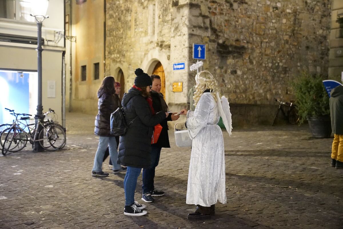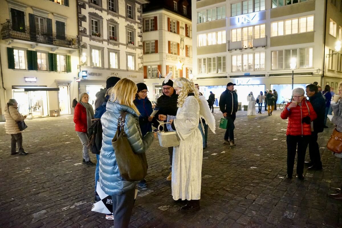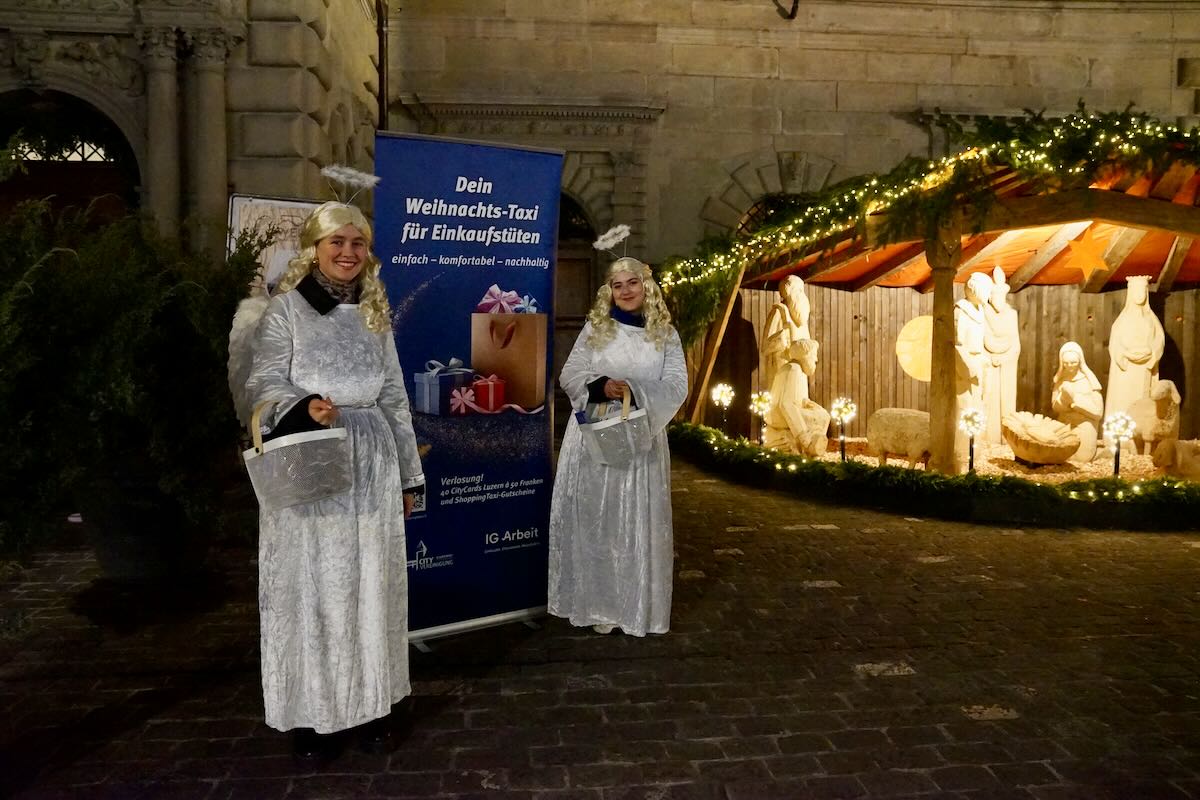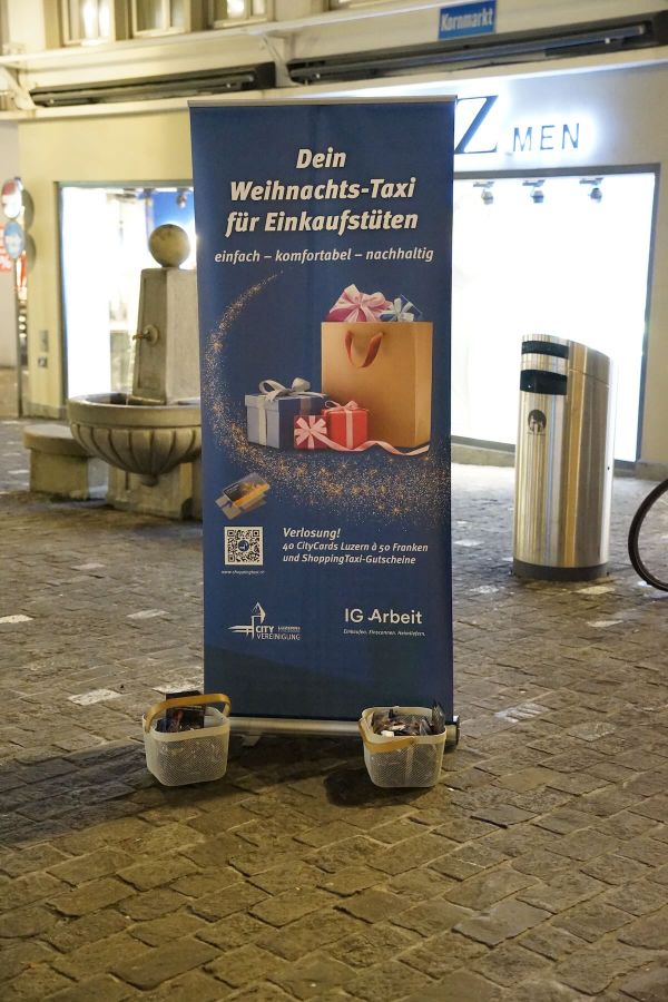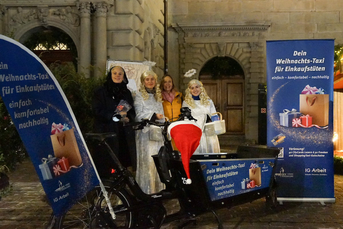 Am Donnerstag, 23. November, präsentierte die City Vereinigung Luzern das «Weihnachts-Taxi für Einkaufstüten» auf dem Kornmarkt. Gemeinsam Quartierverein Altstadt Luzern und dem Krippen-Apéro wurde das Projekt der Öffentlichkeit vorgestellt. Engel verteilten gluschtige Schoggibäume der Stiftung Brändi und Informations-Flyer über die Kampagne.