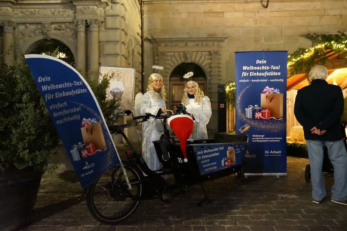 Die City Vereinigung Luzern unterstützt das bestehende Angebot «ShoppingTaxi» der IG Arbeit während der Adventszeit. Mit dem «ShoppingTaxi» können Sie Ihre Weihnachtseinkäufe einfach und komfortabel nach Hause liefern lassen. Dank den schnellen Velo-Flitzern sind Ihre Einkaufstüten im Nu bei Ihnen zu Hause. So haben Sie mehr Zeit für einen entspannten Weihnachtsbummel in der Stadt.